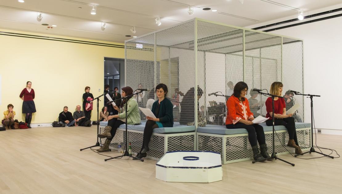 Collective conversations are actions that strive to integrate writing and its sound emission through the voice of the speaker in relation with the different levels of discourse that are present in a contemporary work of art. They are always held collectively, in a multivocal and polyphonic manner, and their aim is to interact in the scope of the installations´ rhythmic emission, within the exhibit space, together with the diagrams and objects.